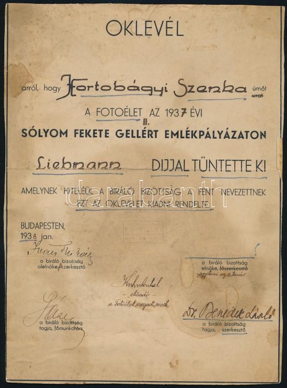 1938 Bp., A Fotóélet folyóirat Sólyom Fekete Gellért Emlékpályázatának... https://www.darabanth.com/de/373-Fernauktion/373.0/Kunst-Dokumente-andere-Sammelgebiete/Dokument~500018/1938-Bp-A-Fotoelet-folyoirat-Solyom-Fekete-Gellert-Emlekpalyazatanak-Liebmann-dij-nevre~II2182510