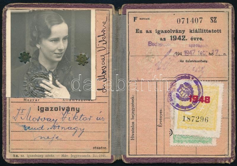 1942-48 MÁV arcképes igazolvány, rendőr őrnagy nejének kiállítva https://www.darabanth.com/de/373-Fernauktion/373.0/Kunst-Dokumente-andere-Sammelgebiete/Dokument~500018/1942-48-MAV-arckepes-igazolvany-rendor-ornagy-nejenek-kiallitva~II2168617