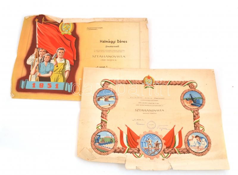 1951 2 db sztahanovista oklevél, szakadt, kissé foltos, https://www.darabanth.com/de/373-Fernauktion/373.0/Kunst-Dokumente-andere-Sammelgebiete/Dokument~500018/1951-2-db-sztahanovista-oklevel-szakadt-kisse-foltos-~II2183780