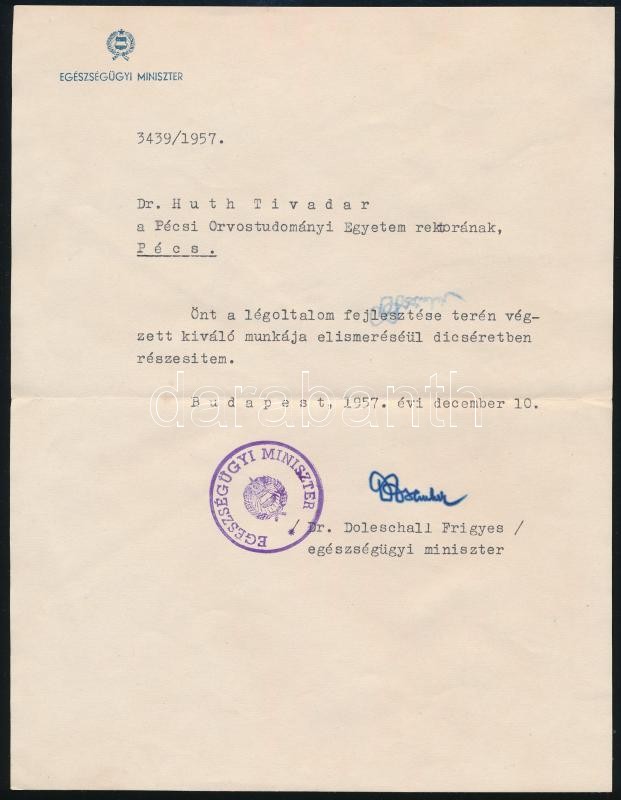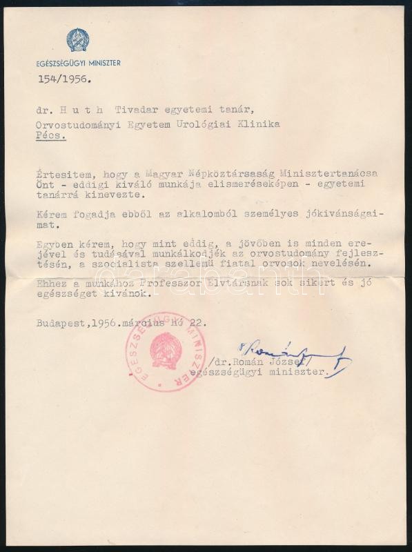 1956-1957 Dr. Doleschall Frigyes és dr. Román József egészségügyi miniszter által aláírt két okmány dr. Huth Tivadar, a Pécsi Orvostudományi Egyetem rektora részére