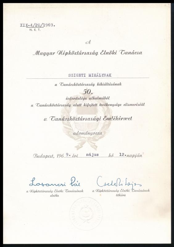 1969 Bp., A Magyar Népköztársaság Elnöki Tanácsa által adományozott ta... https://www.darabanth.com/de/373-Fernauktion/373.0/Kunst-Dokumente-andere-Sammelgebiete/Dokument~500018/1969-Bp-A-Magyar-Nepkoztarsasag-Elnoki-Tanacsa-altal-adomanyozott-tanacskoztarsasagi-e~II2182276