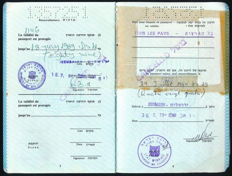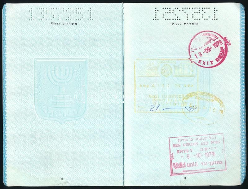1979 Izraeli útlevél, román bejegyzéssel / Israeli passport https://www.darabanth.com/de/373-Fernauktion/373.0/Kunst-Dokumente-andere-Sammelgebiete/Dokument~500018/1979-Izraeli-utlevel-roman-bejegyzessel-Israeli-passport~II2182139