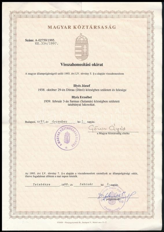 1998 Tatabánya, Magyar Köztársaság által kiállított visszahonosítási o... https://www.darabanth.com/de/373-Fernauktion/373.0/Kunst-Dokumente-andere-Sammelgebiete/Dokument~500018/1998-Tatabanya-Magyar-Koztarsasag-altal-kiallitott-visszahonositasi-okirat-szakadassal-~II2182285