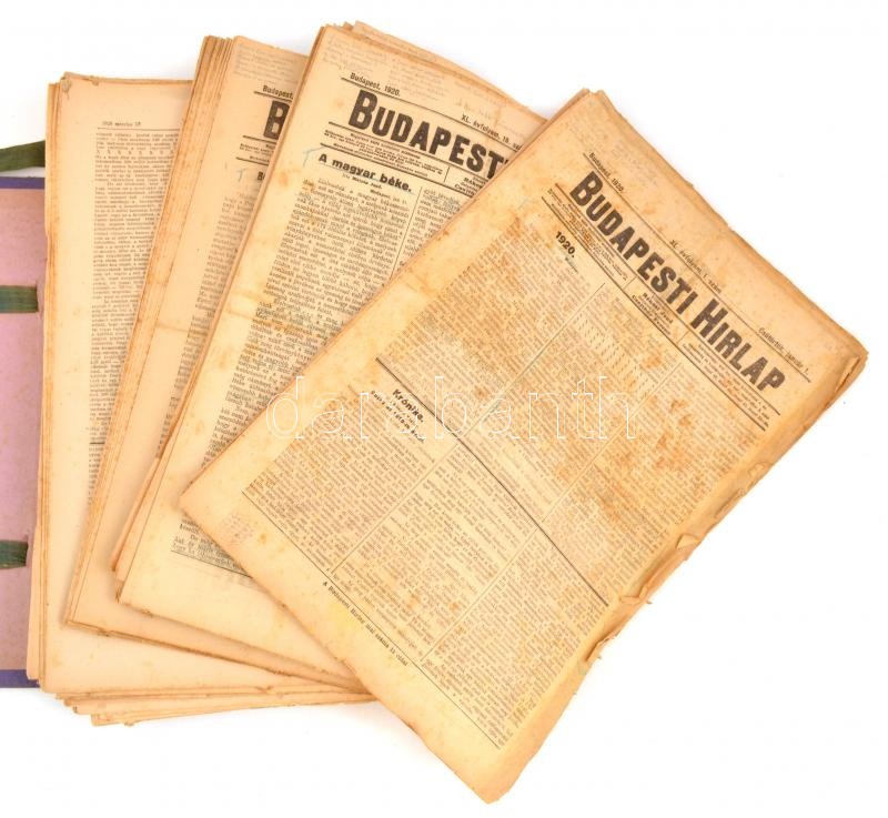 1920 Budapesti Hírlap, 1920. jan. 1-dec. 31., Szerk.: Rákosi Jenő. Egykorú válogatás a Budapesti Hírlap 1920-as év számaiból, nem teljes évfolyam, és nem teljes számok, hiányosak, néhol csak címlap, néhol csak lapok. Közte egy-két más jellegű,de azonos évből származó újsággal. Rengeteg érdekesebb hírrel, közte Horthy kormányzóvá választásával, Horthy-manifesztumával, Trianonnal kapcsolatos hírekkel.