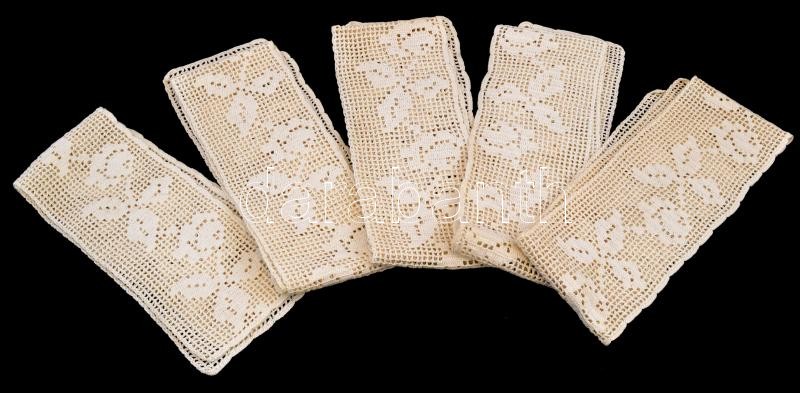 Beschreibung: 5 db polcdíszítő terítő, enyhén koszos, kopottas állapotban, 10x96 cm