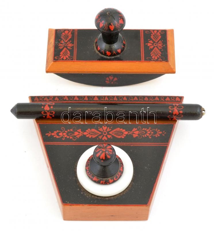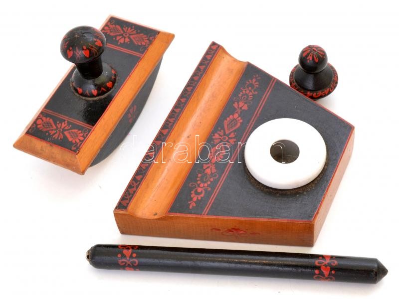 Iparművészeti Vállalatos, népies mintájú fa-porcelán tintatartó és fa tolltest és tapper, zsűrizett, használt állapotban, tapper: 6x9 cm, tintatartó: 8,5x10,5 cm, tolltest h: 13cm