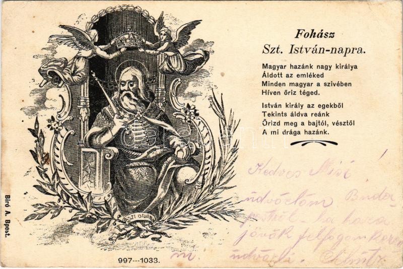 1903 Fohász Szt. István napra 997-1033. Bíró A. / Stephen I of Hungary... https://www.darabanth.com/de/374-Fernauktion/374.0/Ansichtskarten/Herrscher-Politiker-Konigshauser~2000099/1903-Fohasz-Szt-Istvan-napra-997-1033-Biro-A-Stephen-I-of-Hungary-Art-Nouveau-EK~II2191930