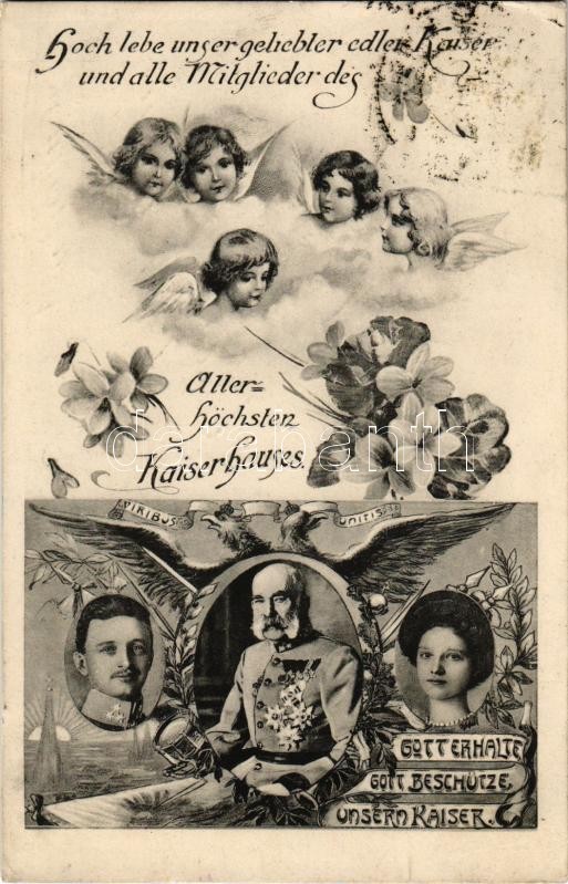 1914 Hoch lebe unser geliebter edler Kaiser und alle Mitglieder des allterhöchsten Kaiserhauses. Gott erhalte Gott beschütze unsern Kaiser! / Franz Joseph I, Charles I of Austria and Queen Zita. Viribus Unitis propaganda. M.M.S. Wien III/2. Nr. 32. Floral (EK)