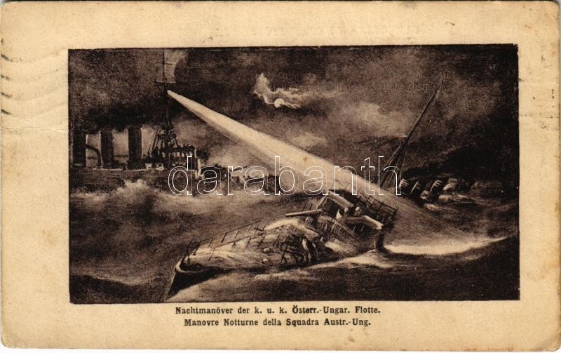 1912 Nachtmanöver der K.u.K. Österr.-Ungar. Flotte, K.u.K. Kriegsmarine / Manovre Notturne della Squadra Austr.-Ung. / Austro-Hungarian Navy, night maneuver with pre-dreadnought battleship and torpedo boat. C. Fano, Pola 1911-12. s: Kappler
