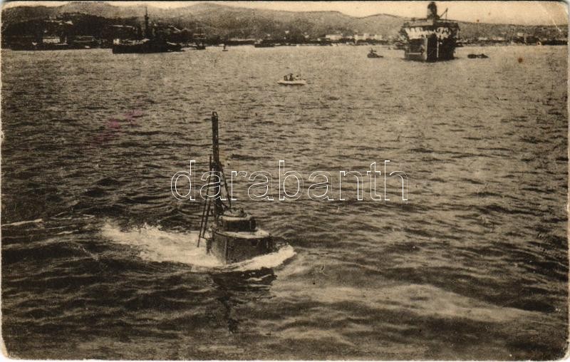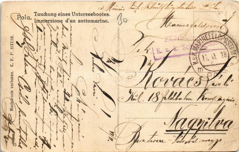 1918 Pola, Tauchung eines Unterseebootes / Immersione d'un sottomarino / Az Osztrák-Magyar Haditengerészet tengeralattjárója merülés közben / WWI Austro-Hungarian Navy, K.u.K. Kriegsmarine, submarine during diving. C. F. P. 1917/18. 15. + "K.U.K. MARINEFELDPOSTAMT POLA" (EK)