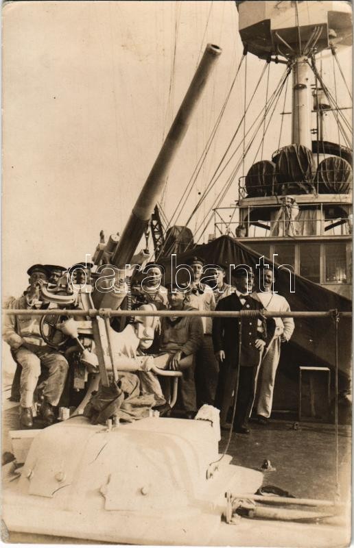 Beschreibung: SMS ZrÃnyi az Osztrák-Magyar Haditengerészet Radetzky-osztályú pre-dreadnought csatahajójának matrózai és kapitánya légvédelmi ágyúval és távcsÅ‘vel / K.u.K. Kriegsmarine / WWI SMS ZrÃnyi Austro-Hungarian Navy Radetzky-class pre-dreadnought battleship, captain and mariners with anti-aircraft gun and binoculars. photo (EK)