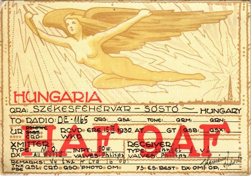 1930 Hungaria. QSL rádióamatőr összeköttetést igazoló művészlap / Hungarian art postcard, QSL confirmation card of a two-way communication between two amateur radio stations s: Wikker F. (apró lyukak / tiny pinholes)