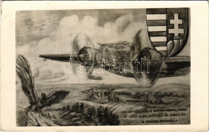 Beschreibung: 1943 A gép dübörög a bomba dörög... Második világháborús katonai repülÅ‘s képeslap magyar cÃmerrel és turul madárral / WWII Hungarian military aircraft with Hungarian coat of arms s: Tóth D. (EK)