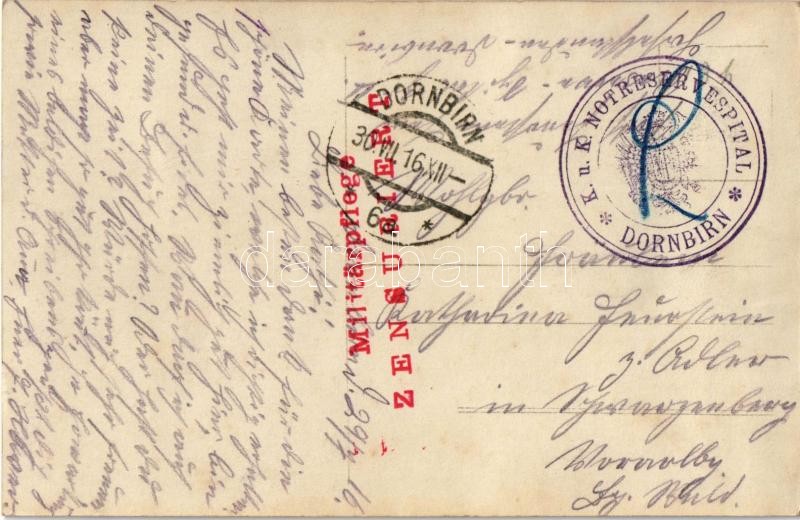Beschreibung: In lieber Gesellschaft / WWI K.u.K. (Austro-Hungarian) military romantic postcard, ijured soldier and Red Cross nurse + K.u.K. Notreservespital Dornbirn"