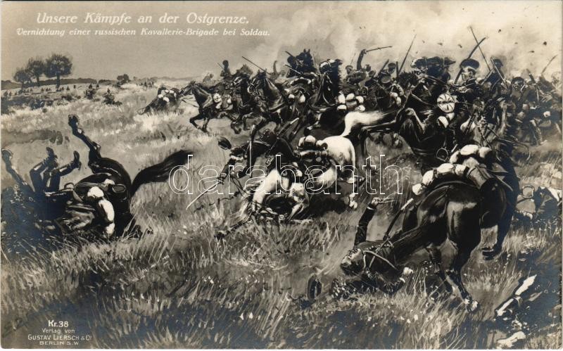 Unsere Kampfe an der Ostgrenze, Vernichtung einer russischen Kavalleri... https://www.darabanth.com/de/374-Fernauktion/374.0/Ansichtskarten/Militaria~2000083/Unsere-Kampfe-an-der-Ostgrenze-Vernichtung-einer-russischen-Kavallerie-Brigade-bei-Soldau-Dzialdo~II2192430