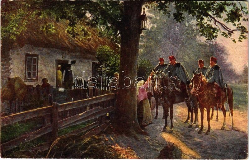 Beschreibung: Weltkrieg 1914-1915 Österr.-ung. Ulanen Patrouille von einem russischen Bauernhaus / WWI K.u.K. (Austro-Hungarian) military art postcard