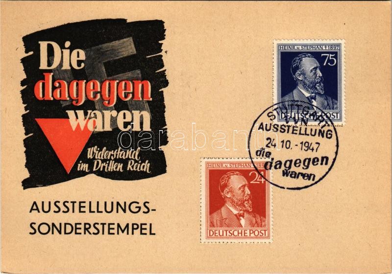 1947 Die dagegen waren. Widerstand im Dritten Reich. Ausstellung der Vereinigung der Verfolgten des Naziregimes, Stuttgart - Schlossplatz / Resistance in the Third Reich. Exhibition of the Association of Victims of the Nazi Regime in Stuttgart. swastika + So. Stpl.