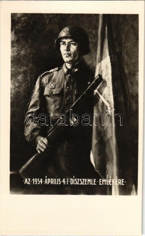 Az 1954. április 4-i díszszemle emlékére. Van hazánk, van mit megvéden... https://www.darabanth.com/de/374-Fernauktion/374.0/Ansichtskarten/Propaganda-Politik~2000091/Az-1954-aprilis-4-i-diszszemle-emlekere-Van-hazank-van-mit-megvedenunk-Kepzomuveszeti~II2186606