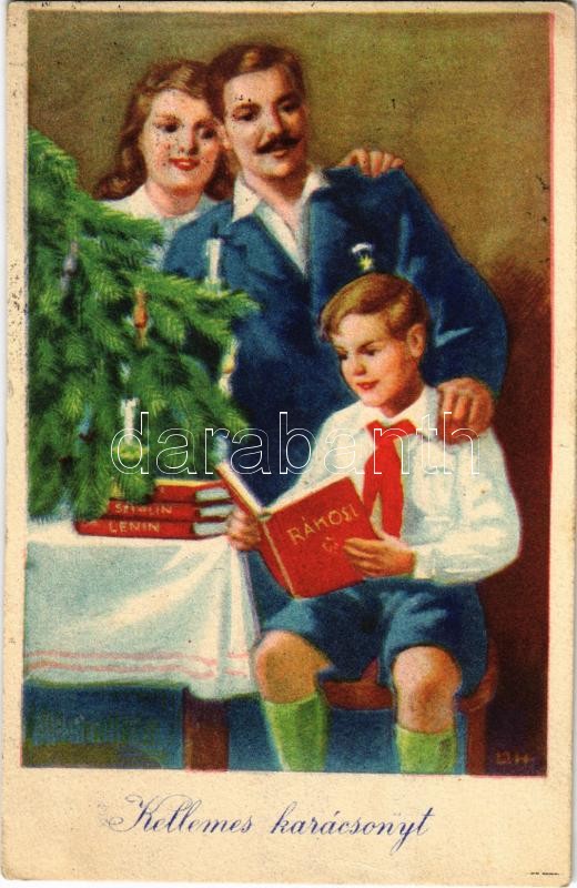 Beschreibung: Magyar szocialista úttörő karácsonyi üdvözlő propagandalap, Rákosi, Lenin, Sztálin könyv. Művészeti Alkotások / Hungarian socialist Christmas propaganda card