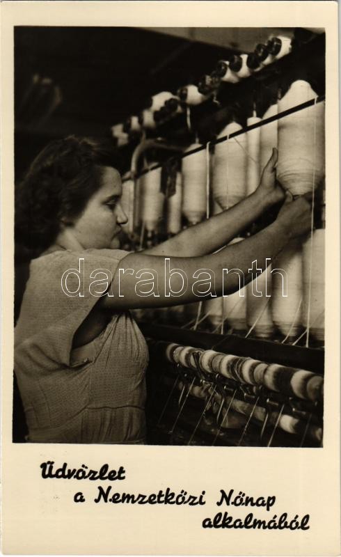 Üdvözlet a Nemzetközi Nőnap alkalmából! A népi demokratikus állam fokozott mértékben megbecsüli a nők munkáját. Magyarországon az érdemrenddel kitüntetett dolgozók 35 százaléka nő. Képzőművészeti Alap Kiadóvállalat / International Women's Day, Hungarian socialist propaganda