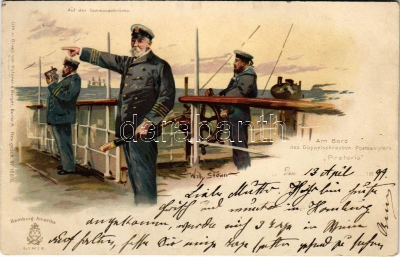1899 Am Bord des Doppelschrauben-Postdampfers "Pretoria", Auf der Commandobrücke. Hamburg-Amerika Linie / Hamburg-America Line, on board of twin screw steamship "Pretoria", captain at the command bridge. Lith. u. Druck von Kutzner & Berger No. 16810. litho s: Willy Stöwer (Rb)