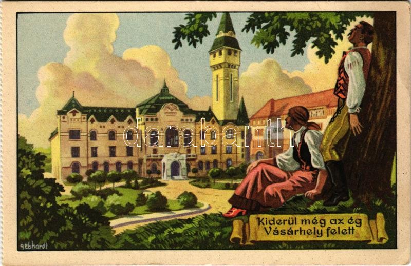 Marosvásárhely, Targu Mures; "Kiderül még az ég Vásárhely felett." Városháza. Kiadja a Székely Egyetemi és Főiskolai Hallgatók Egyesülete / Hungarian irredenta art postcard, town hall s: Gebhardt - képeslapfüzetből / from postcard booklet (EK)