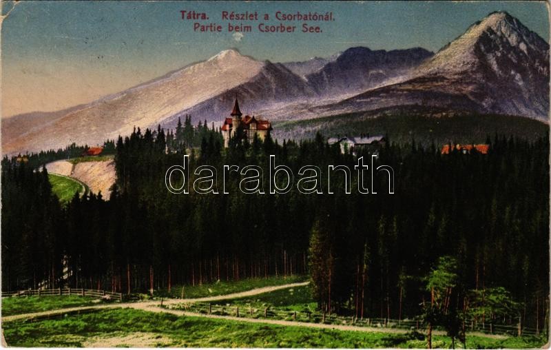 1917 Tátra, Magas Tátra, Vysoké Tatry; Részlet a Csorba-tónál, szálloda. Cattarino S. utóda Földes Samu kiadása 191. sz. / Csorba-See / Strbské pleso / hotel by the lake (ázott sarok / wet corner)
