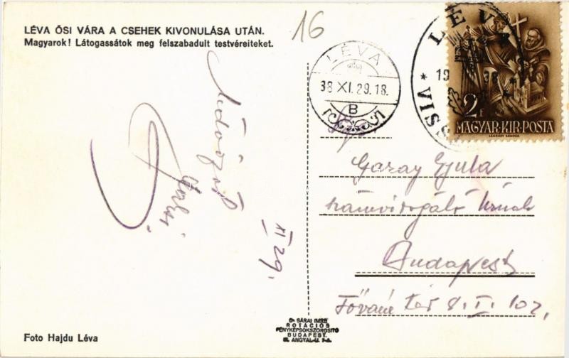 Léva, Levice; Léva ősi vára a csehek kivonulása után "Magyarok! Látogassátok meg felszabadult testvéreiteket!" / castle. Foto Hajdu + 1938 Léva visszatért So. Stpl.