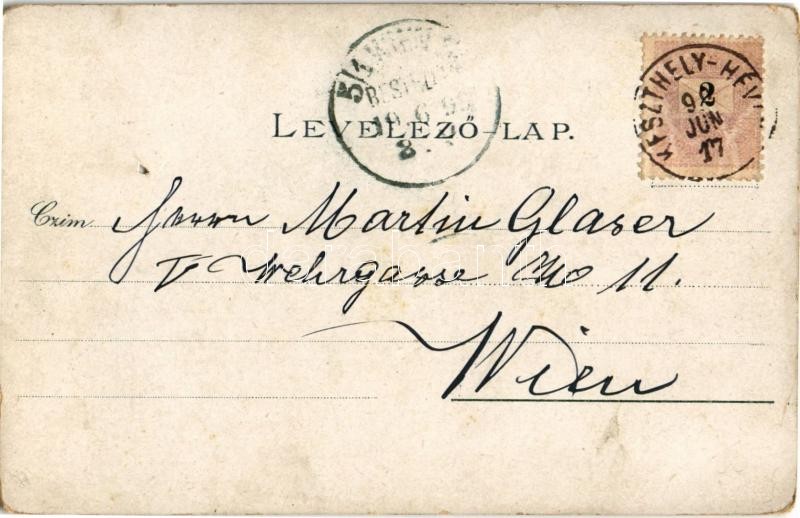1899 Keszthely, főgimnázium, Fő utca, Balaton fürdő, Gazdasági tanintézet, Gróf Festetics palota. Marton Móricz kiadása, Ottmar Zieher floral Art Nouveau litho (lyuk / hole)