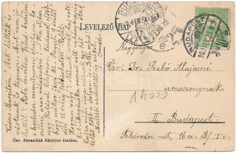 Beschreibung: 1909 Budapest X. Kőbánya, Dreher serfőzde, sörgyár. Özv. Merendiák Károlyné kiadása (apró szakadás / tiny tear)
