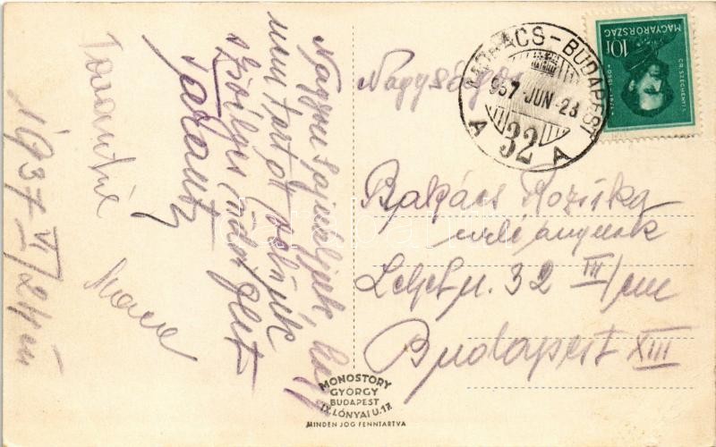 Beschreibung: 1937 Érd, Országzászló, műút, Diósd kertvárosi strand, fürdőzők, Érdliget vasútállomás, Diósd kervárosi kaszinó + "MOHÁCS - BUDAPEST 32 A" vasúti mozgóposta bélyegző (EK)