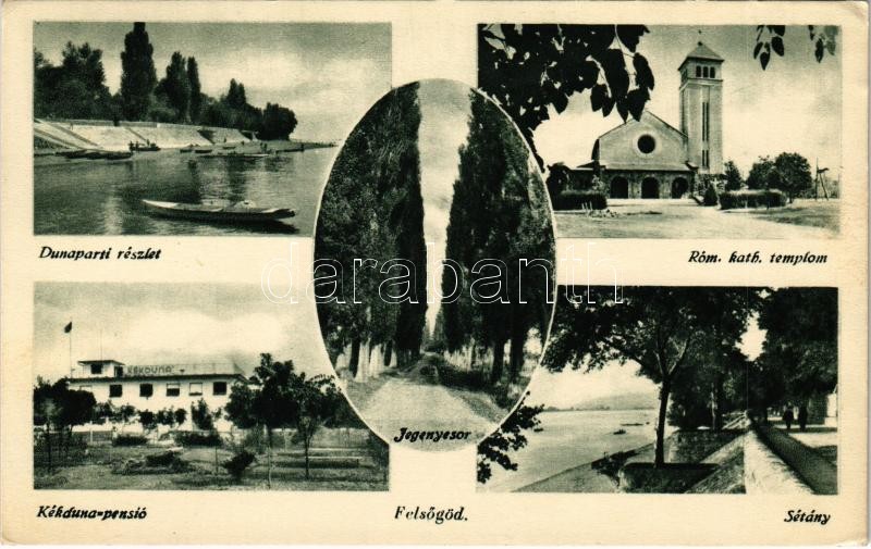 Beschreibung: 1940 Felsőgöd (Göd), Duna-parti részlet, csónakok, Római katolikus templom, jegenyesor, Kékduna panzió, sétány. Gyimesi Kálmánné kiadása (EK)