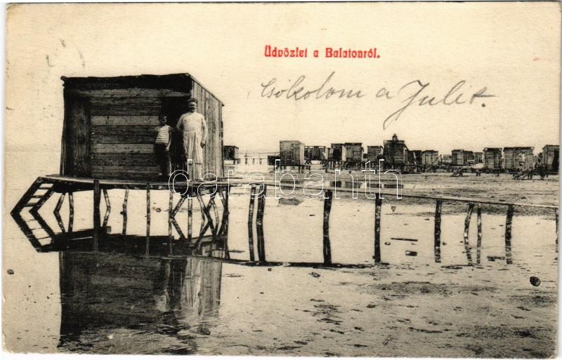 Beschreibung: Balaton, strand, fürdőkabinok
