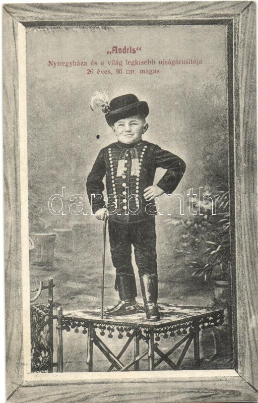 Nyíregyháza, Andris, a világ legkisebb újságárusítója 26 évesen 86 cm ... https://www.darabanth.com/de/374-Fernauktion/374.0/Ansichtskarten/Ungarn~2000004/Nyiregyhaza-Andris-a-vilag-legkisebb-ujsagarusitoja-26-evesen-86-cm-magas-Szanto-Erno~II1589605