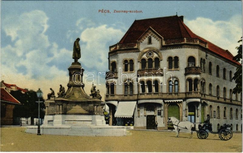 Pécs, Zsolnay szobor, lovashintó, üzlet https://www.darabanth.com/de/374-Fernauktion/374.0/Ansichtskarten/Ungarn~2000004/Pecs-Zsolnay-szobor-lovashinto-uzlet~II2188442