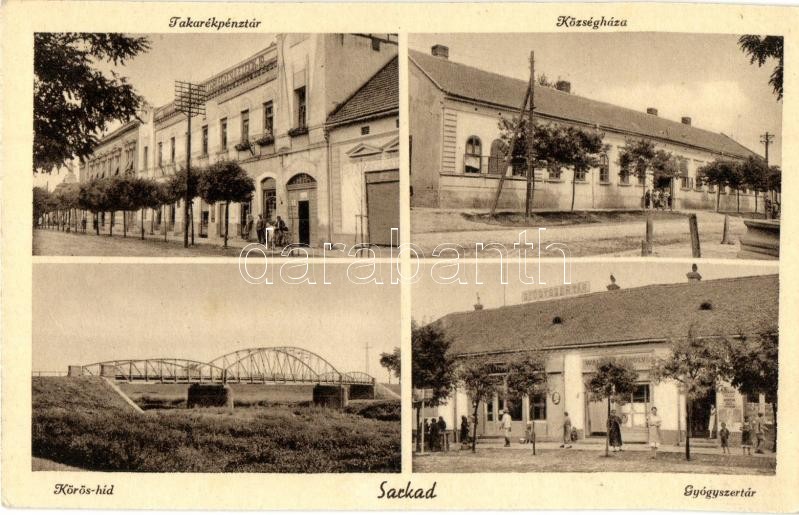 Sarkad, Takarékpénztár, Községháza, Körös híd, Gyógyszertár https://www.darabanth.com/de/374-Fernauktion/374.0/Ansichtskarten/Ungarn~2000004/Sarkad-Takarekpenztar-Kozseghaza-Koros-hid-Gyogyszertar~II1843425