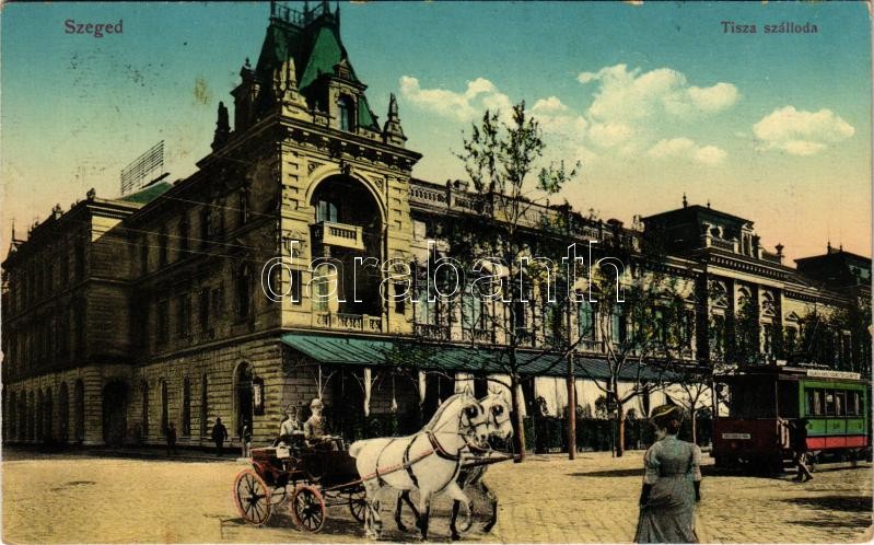 Szeged, Tisza szálloda, villamos, hintó (Rb) https://www.darabanth.com/de/374-Fernauktion/374.0/Ansichtskarten/Ungarn~2000004/Szeged-Tisza-szalloda-villamos-hinto-Rb~II2191091