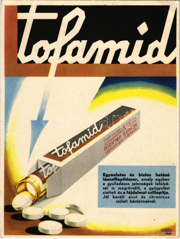 1949 Tofamid egyenletes és biztos hatású lázcsillapítás. Richter Gedeon Vegyészeti Gyár rt. / Hungarian antipyretic medicine advertisement (16,3 x 12,1 cm)