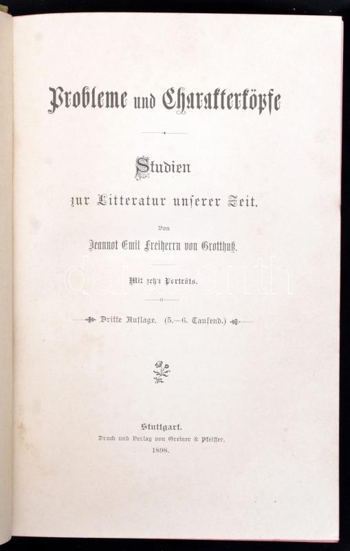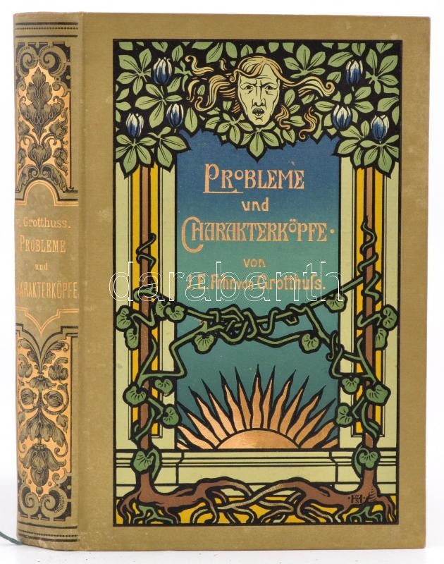 Jeannot Emil Freiherrn von Grotthuss: Probleme und Charakterköpfe. Studien zur Litteratur Unserer Zeit. Stuttgart, 1898., Greiner & Pfeiffer. Német nyelven. Kiadói szecessziós aranyozott, festett egészvászon-kötés, festett lapélekkel, kissé foltos hátsó borítóval.