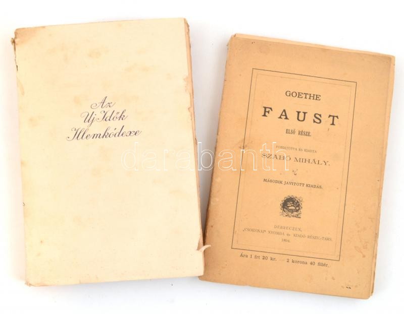 Goethe: Faust. I. rész. Ford. és kiadta: Szabó Mihály. Debrecen, 1894., "Csokonai". Második, javított kiadás. Kiadói papírkötés.