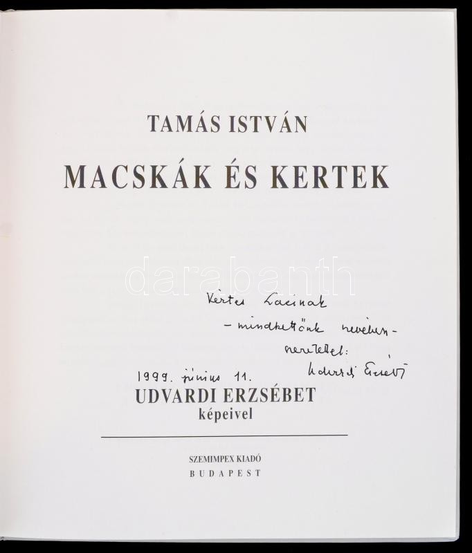 Tamás István: Macskák és kertek. Udvardi Erzsébet képeivel. Bp., é.n., Szemimpex. Udvardi Erzsébet (1929-2013) által dedikált és dátumozott! Színes reprodukciókkal. Kiadói kartonált papírkötés.