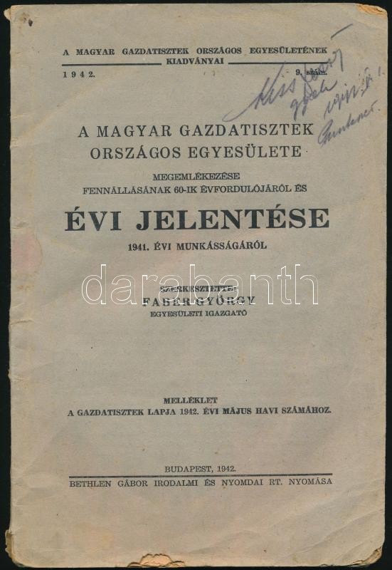 1942 Magyar Gazdatisztek Országos Egyesülete Megemlékezése fennállásánek 60-ik évfordulójáról és évi jelentése 1941. évi munkásságáról. Szerk.: Faber György. Magyar Gazdatisztek Országos Egyesületének kiadványai. 9. sz. Bp., 1942., Bethlen G.-ny., 80 p. Melléklet a Gazdatisztek Lapja 1942. évi május havi számához. Fekete-fehér fotókkal, közte az egyesület elnökségéről. Kiadói kissé szakadozott papírkötés, egy-két lapon aláhúzással.