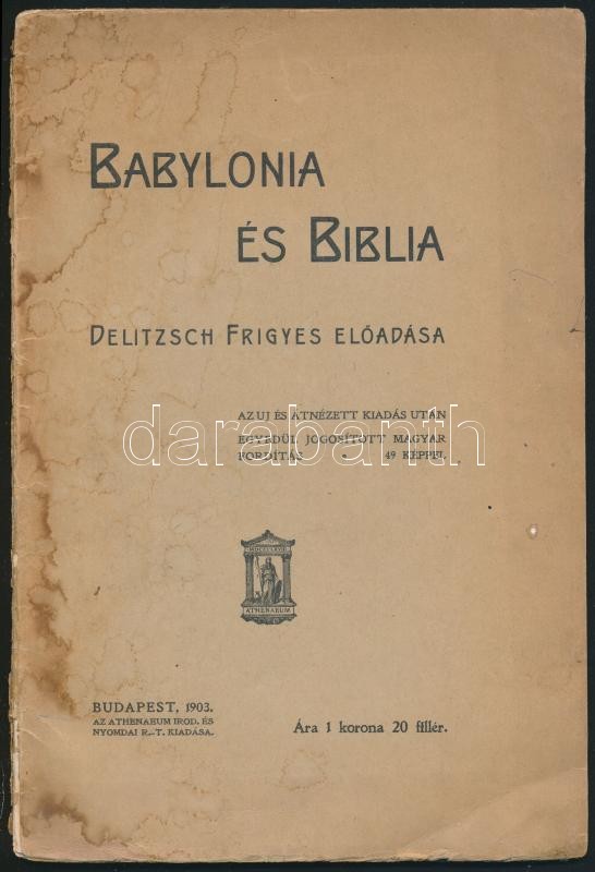 Delitzsch Frigyes: Babylonia és Biblia. Bp., 1903, Athenaeum. 44p. 49 fekete-fehér képpel illusztrálva. Az uj és átnézett kiadás után egyedül jogosított magyar fordítás. Kiadói papírkötés, foltos borító elvált a testtől.