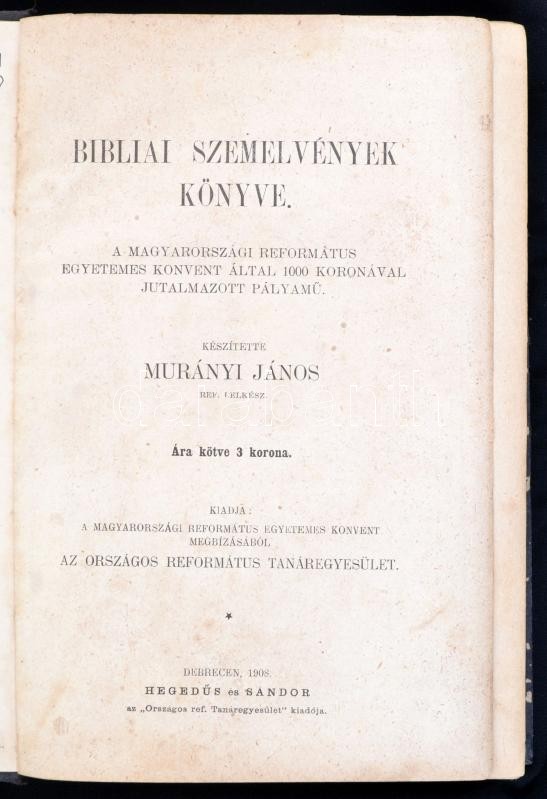 Murányi János: Bibliai szemlvényxek könyve. Kiadja: a Magyarországi Református Egyetemes Konvent megbízásából az Országos Református Tanáregyesület. Debrecen, 1908., Hegedűs Sándor, 1 t.+VIII+524 p.+3 t+4 p. Kiadói kopott,foltos egészvászon-kötésben, márványozott lapélekkel.