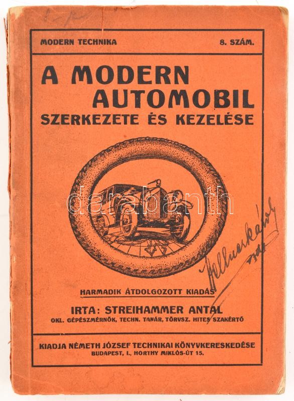 Streihammer Antal: A modern automobil szerkezete és kezelése. Modern T... https://www.darabanth.com/de/374-Fernauktion/374.0/Bucher/Bucher-Technik~1000015/Streihammer-Antal-A-modern-automobil-szerkezete-es-kezelese-Modern-Technika-8-sz-Bp-1927-Nem~II2147068
