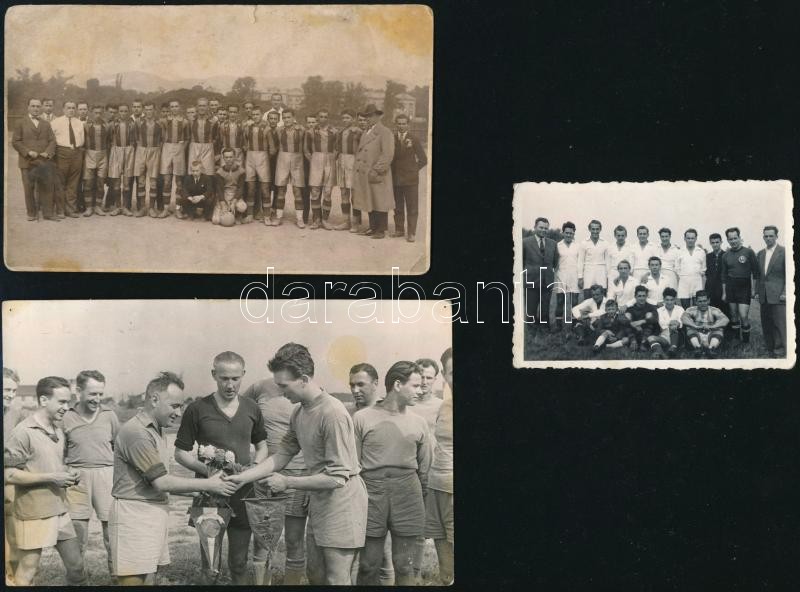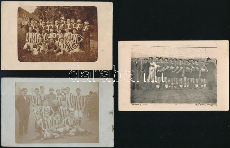 cca 1914-1959 6 db fénykép labdarúgó csapatokról, fotók, fotólapok, változó állapotban, az egyik foltos kopott, az egyiken folt, 14x9 cm és 8x5 cm közötti méretben