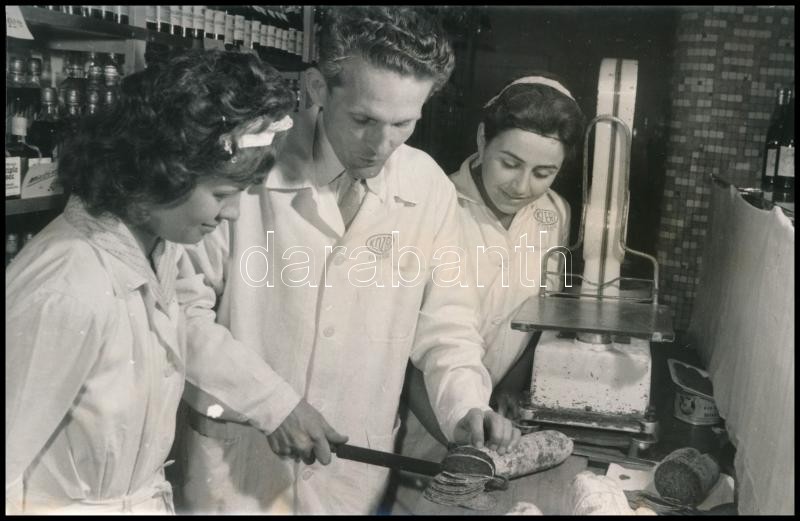 Beschreibung: cca 1965 Budapest, felvágott-oktatás egy XI. kerületi KÖZÉRT-ben, fotó, 12×18 cm