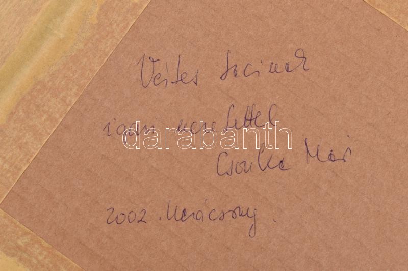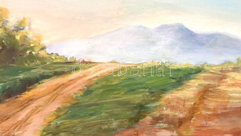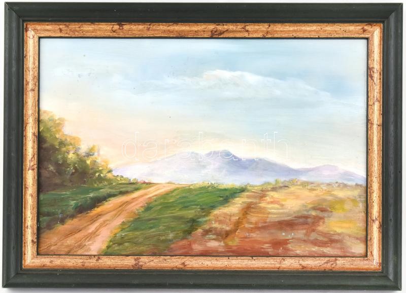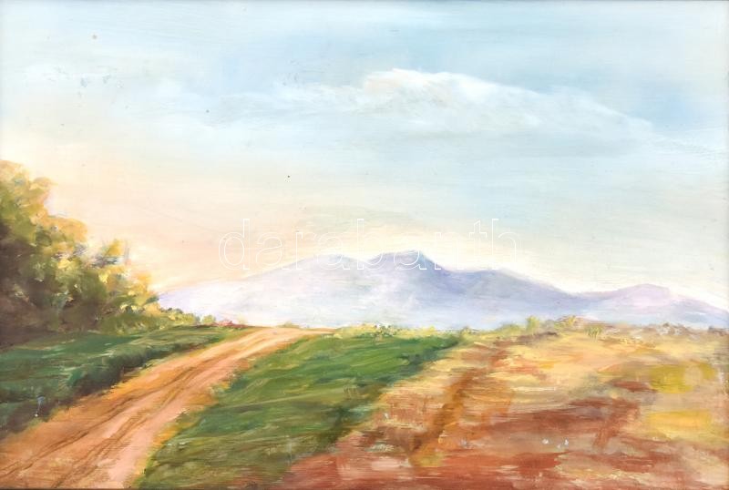 Beschreibung: Csonka Mária (?-): Hegyvidéki táj. Olaj, karton, hátoldalán jelzett és ajándékozási sorokkal, fa keretben, 20×30 cm