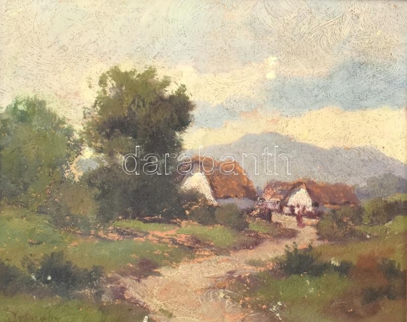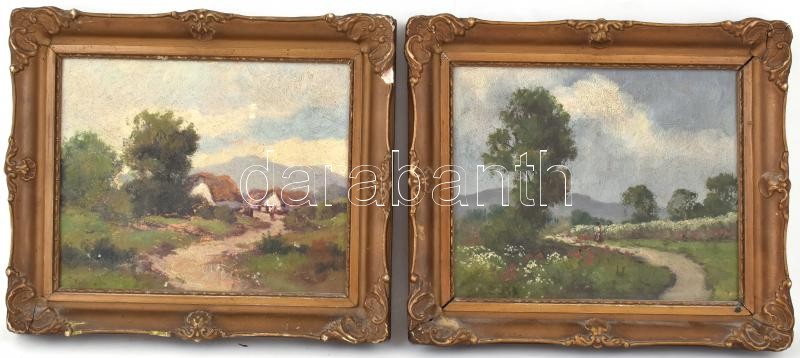 Beschreibung: Datsinka jelzéssel, 2 db mű: Virágzó táj és Házak. Olaj, karton, díszes, kissé sérült keretben, 21,5×26,5 cm