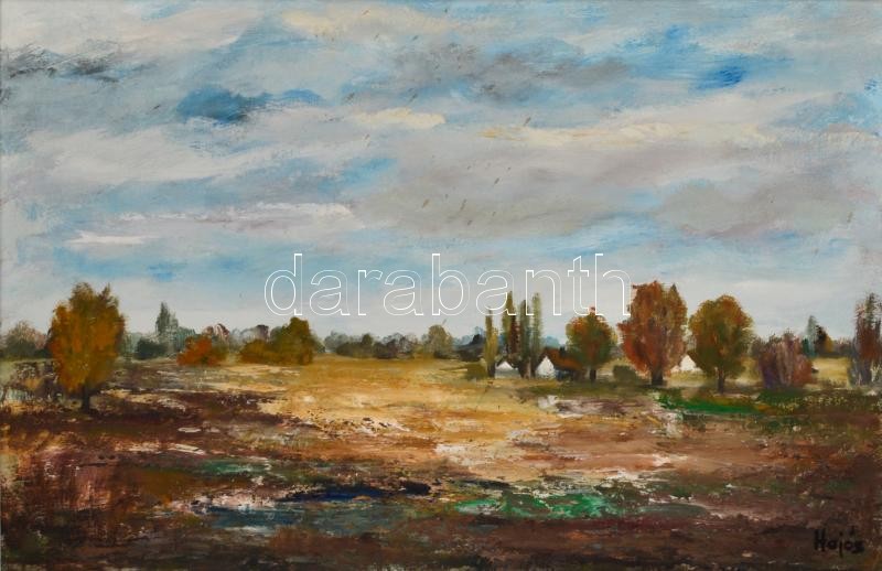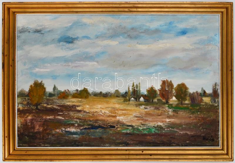 Beschreibung: Hajós Hollanda Éva (1935-): Táj tanyával. Olaj, farost, jelzett, fa keretben, 40x60 cm